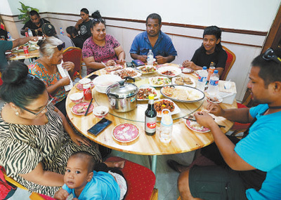 瑙魯民眾在當(dāng)?shù)匾患抑胁蛷d聚餐。新華社記者 王 申攝