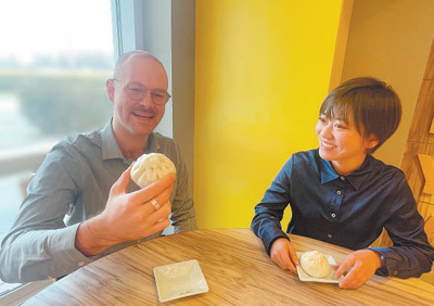 在上海迪士尼度假區(qū),卡林(左)和同事一起品嘗包子。人民日?qǐng)?bào)記者 曹玲娟攝