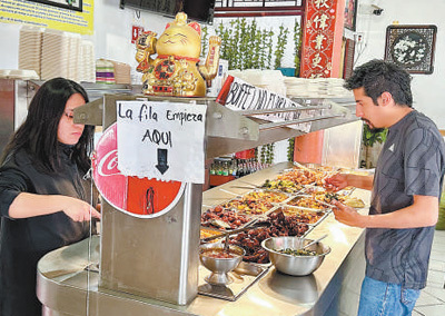 在墨西哥城一家中餐自助餐廳內(nèi),當(dāng)?shù)厥晨吞暨x菜品。人民日?qǐng)?bào)墨西哥分社 埃內(nèi)斯托·多明戈斯攝