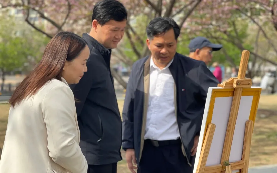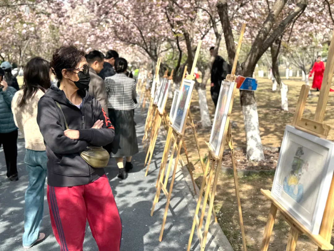 畫(huà)展布置于西北湖公園的櫻花大道上,眾多市民在櫻花樹(shù)下駐足欣賞。