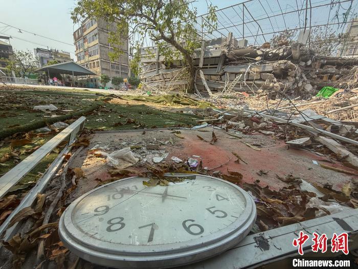 當(dāng)?shù)貢r(shí)間4月2日,因地震造成教學(xué)樓坍塌的緬甸曼德勒孔教學(xué)校北校區(qū)現(xiàn)場(chǎng),一臺(tái)時(shí)鐘“躺”在廢墟中,時(shí)間定格在地震發(fā)生的一刻。 中新社記者 陳永諾 攝