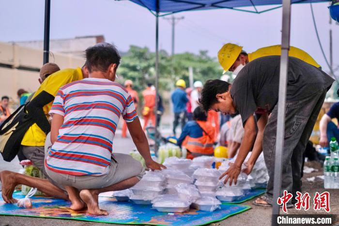 當(dāng)?shù)貢r(shí)間4月3日傍晚,中國(guó)救援隊(duì)伍在緬甸曼德勒一倒塌建筑持續(xù)搜救,當(dāng)?shù)孛癖姙榫仍?duì)隊(duì)員準(zhǔn)備盒飯,感謝他們的幫助。 中新社記者 陳永諾 攝