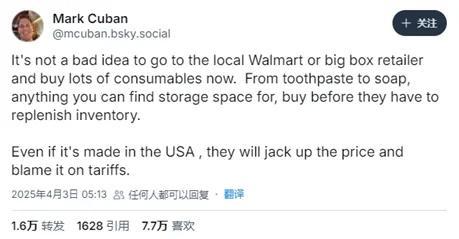 4月2日下午,美國(guó)知名投資人、億萬(wàn)富翁馬克·庫(kù)班在社交平臺(tái)寫道,是時(shí)候開始囤貨了。庫(kù)班說(shuō):“從牙膏到肥皂,凡是能找到地方可以儲(chǔ)存的東西,都應(yīng)該趁早買起來(lái),最好是在商店補(bǔ)貨前購(gòu)買。”庫(kù)班說(shuō),即使是美國(guó)制造的商品,也有可能漲價(jià),“他們會(huì)歸咎于關(guān)稅”。