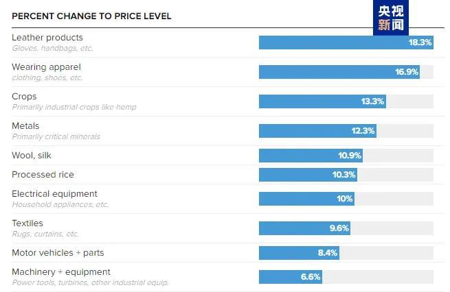 據(jù)耶魯大學(xué)預(yù)算實(shí)驗(yàn)室預(yù)測(cè),皮革制品、衣服、農(nóng)作物、金屬、羊毛等類別產(chǎn)品價(jià)格漲幅將超過(guò)10%。