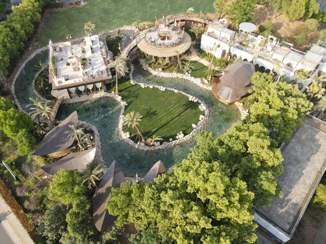 白丁藝術(shù)島坐落于武漢國際體育文化休閑園內(nèi),總占地面積近4000m2。踏進(jìn)這座蘊(yùn)含東南亞風(fēng)情的神秘小島,組合式藝術(shù)空間藏在繁茂的熱帶植物中,近200米長的生態(tài)水系蜿蜒貫穿,法式南洋風(fēng)情藝術(shù)空間群由連廊貫通,筆直的中東海藻、加那利海棗高大挺拔。