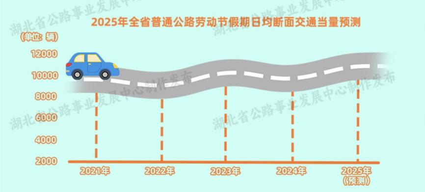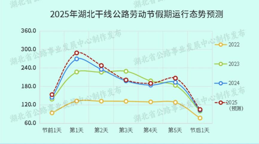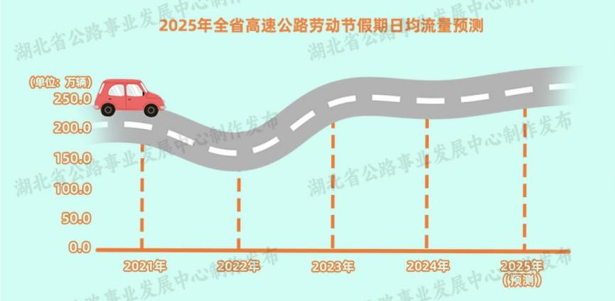 湖北省公路事業(yè)發(fā)展中心根據(jù)歷年路網(wǎng)運行數(shù)據(jù)分析,結(jié)合假期全省路網(wǎng)天氣預(yù)測以及近期車流量等運行實際,預(yù)計勞動節(jié)假期期間高速路網(wǎng)通行車輛流量為近期平日日均流量的2.14倍,較2024年勞動節(jié)假期日均流量同比增長約5%。