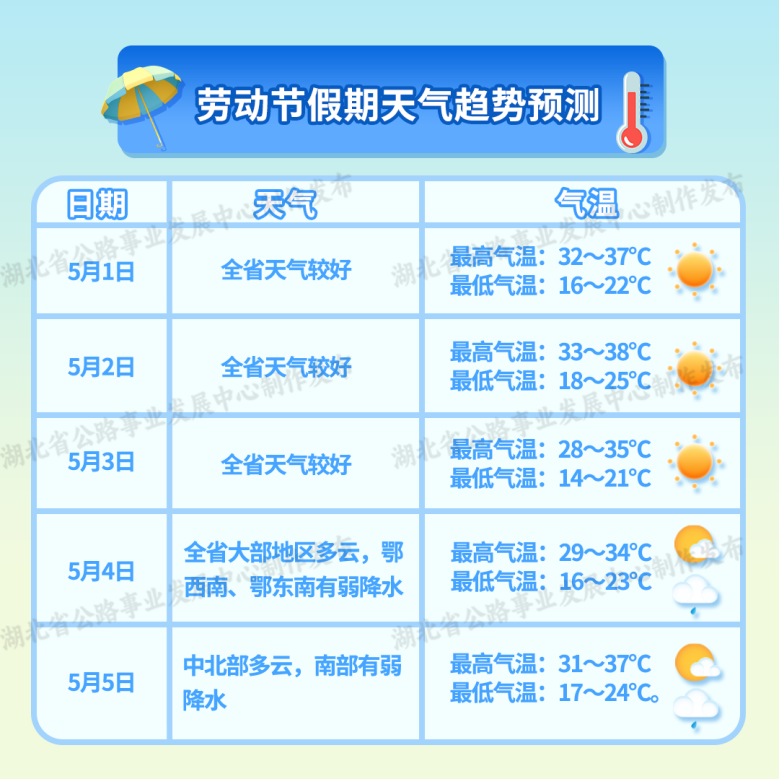 湖北省公路事業(yè)發(fā)展中心經(jīng)與省氣象服務(wù)中心會商研判,預(yù)計今年勞動節(jié)小長假期間(5月1日—5日),我省前晴后雨,氣溫變化平穩(wěn),溫度適宜,天氣條件總體利于出行。其中,5月1日—3日全省天氣較好;4日大部地區(qū)多云,鄂西南、鄂東南有弱降水;5日中北部多云,南部有弱降水。