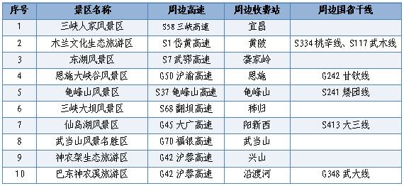 流量集中的高速公路收費站主要有S15漢蔡高速琴臺站,S7武鄂高速龔家?guī)X站,S1岱黃高速府河站,S58三峽高速宜昌站,S17硚孝高速徑河站,G50滬渝高速黃石北站、潛江站,G55二廣高速荊州中站、襄陽西站,G70 福銀高速十堰東站。