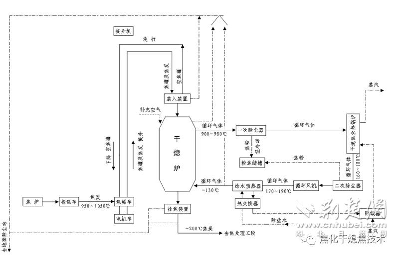 干熄焦,相對(duì)濕熄焦而言,是指采用惰性氣體將紅焦降溫冷卻的一種熄焦方法。在干熄焦過程中,紅焦從干熄爐頂部裝入,低溫惰性氣體由循環(huán)風(fēng)機(jī)鼓入干熄爐冷卻段紅焦層內(nèi),吸收紅焦顯熱,冷卻后的焦炭從干熄爐底部排出,從干熄爐環(huán)形煙道出來的高溫惰性氣體流經(jīng)干熄焦鍋爐進(jìn)行熱交換,鍋爐產(chǎn)生蒸汽,冷卻后的惰性氣體由循環(huán)風(fēng)機(jī)重新鼓入干熄爐,惰性氣體在封閉的系統(tǒng)內(nèi)循環(huán)使用。該技術(shù)可節(jié)約用水、減少大氣污染物排放,回收大量紅焦顯熱并產(chǎn)生中高壓蒸汽,有效提高能源利用效率及焦炭質(zhì)量,擴(kuò)大煉焦煤適應(yīng)性,降低煉鐵工序能耗,最終實(shí)現(xiàn)企業(yè)的節(jié)能減排。