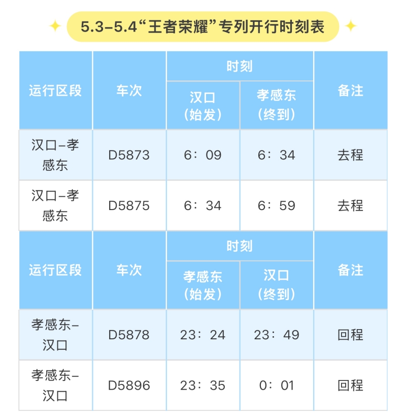 “王者榮耀專列”(5月3日和5月4日),每日安排四趟為您免費服務,在漢口站、孝感東站、孝感奧體中心專列服務臺領取“王者榮耀專列乘車證”直接進出站乘車,數(shù)量有限,先到先得,送完為止!具體時刻表如下: