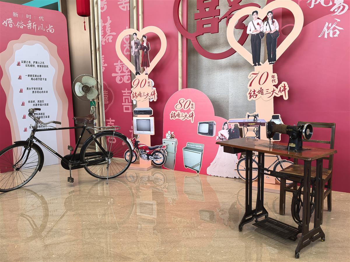 在不同年代結(jié)婚證展示區(qū)旁邊,還展示了過去結(jié)婚時的“三件套”。在50、60年代,一只熱水瓶、一個臉盆就能結(jié)婚;到了70年代,“三轉(zhuǎn)一響”,即自行車、縫紉機(jī)、手表、收音機(jī)成為標(biāo)配;到了80年代,結(jié)婚三件套又變成了電視機(jī)、洗衣機(jī)、冰箱;90年代又有了一些新變化。到如今,提倡的是“一束鮮花表心意,兩心相守勝千金”“拒絕高價彩禮”等婚俗新風(fēng)尚。