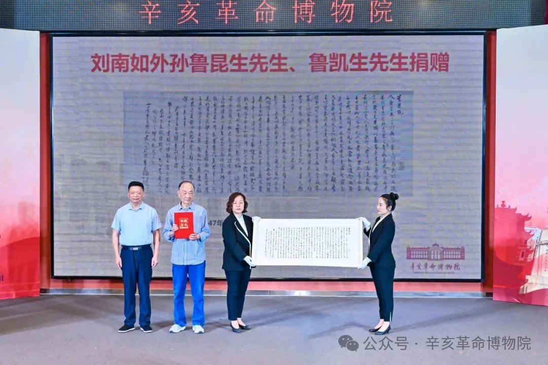 5月14日上午,我院2025年度辛亥革命文物資料捐贈儀式在南區(qū)報告廳舉行。辛亥后裔魯昆生先生、魯凱生先生、倪祖冀先生,畫家周石峰先生的女兒周露露女士,武漢市德森地契博物館館長李純女士受邀作為捐贈者代表出席了捐贈儀式。
