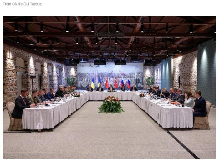 綜合英國天空新聞網(wǎng)、法新社報道,視頻顯示,烏克蘭代表團坐在桌子一旁,面對著俄羅斯代表團。土耳其外交部長哈坎·費丹首先致歡迎詞,并發(fā)表講話。