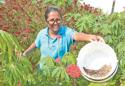 在中國(guó)援蘇里南農(nóng)業(yè)技術(shù)合作中心試驗(yàn)田里,莎莉娜展示她收集的作物種子。本報(bào)墨西哥分社 埃內(nèi)斯托·多明戈斯攝