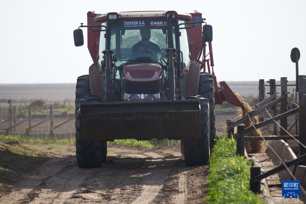5月14日,工作人員在阿根廷潘帕斯草原萊因迪亞納牧場駕駛喂食機投食。新華社記者 孟鼎博 攝