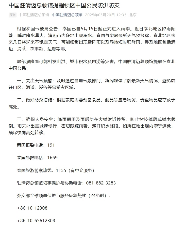 局部強降雨可能引發(fā)山洪、城市積水及內(nèi)澇等災(zāi)害。中國駐清邁總領(lǐng)館提醒在泰北中國公民: