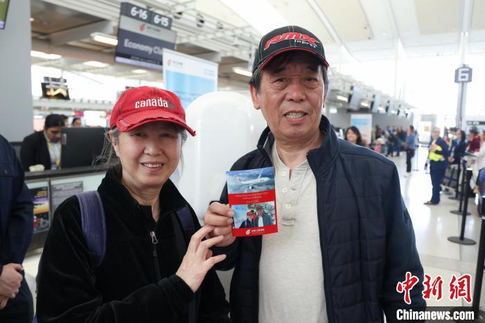 當?shù)貢r間5月20日,旅客姜先生與夫人在多倫多皮爾遜國際機場辦理登機手續(xù)之后拍攝紀念照片,他們將搭乘CA994航班前往北京。中新社記者 余瑞冬 攝