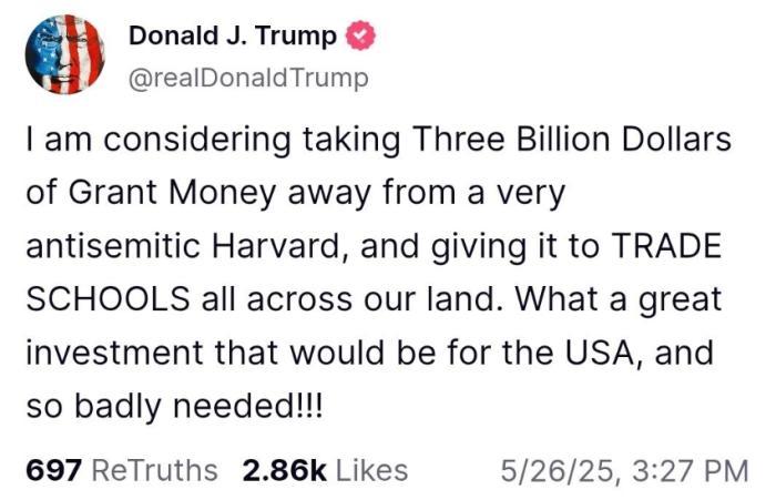 中新網(wǎng)5月27日電 據(jù)《紐約時報》報道,美國總統(tǒng)特朗普26日就其打算從哈佛大學剝離30億美元撥款一事提出新計劃,他在社交媒體帖子中表示,他正考慮把這筆錢分配給職業(yè)學校。