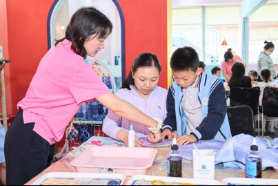 5月24日上午,省婦女兒童活動(dòng)中心一樓親子空間迎來了首批50組親子家庭,參加“童樂童年”親子手工坊活動(dòng)。活動(dòng)現(xiàn)場設(shè)置了植物印染、非遺扎染、黏土創(chuàng)作、傳統(tǒng)書畫四個(gè)特色體驗(yàn)區(qū),孩子們?cè)诶蠋煹闹笇?dǎo)下,充分發(fā)揮想象力,創(chuàng)作出各具特色的手工作品。活動(dòng)鍛煉了孩子們的動(dòng)手能力,也讓他們深刻感受到中華優(yōu)秀傳統(tǒng)文化的魅力。