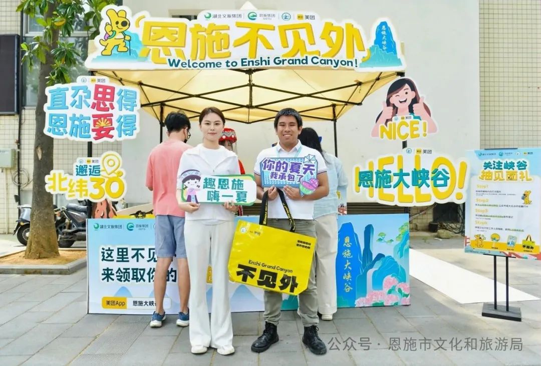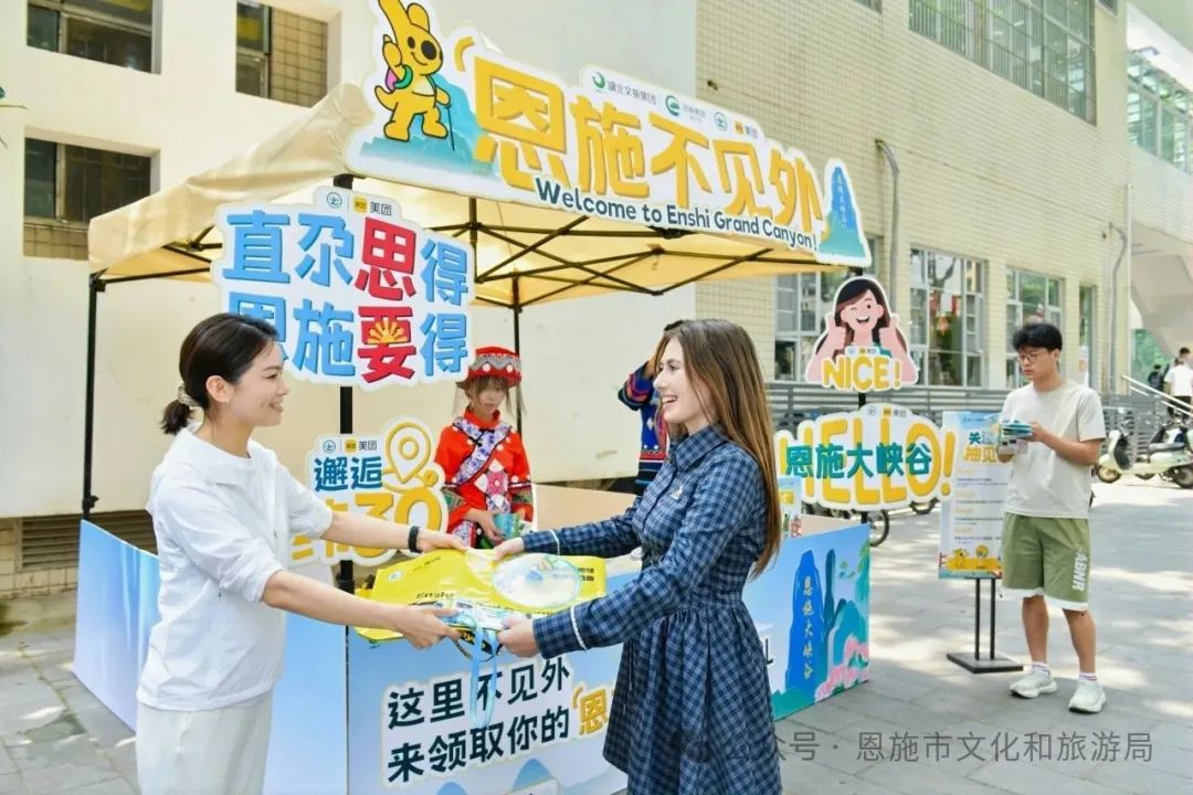 恩施市文化和旅游局主要負責人全程參與了活動,并與前來體驗快閃互動的外國留學生親切交談,熱情歡迎他們來恩施旅游,還為他們送上見面禮周邊。留學生們手持周邊在快閃點位前留下合影,生動詮釋了“恩施熱情不見外”的國際友好活動內(nèi)核,展現(xiàn)了恩施市開放包容的城市形象和對國際游客的熱情歡迎。