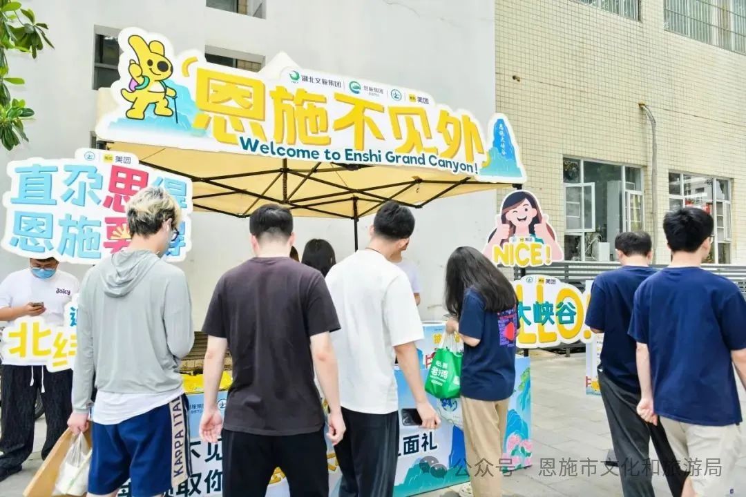 活動現(xiàn)場,熱情洋溢的恩施土家族幺哥幺妹手持手舉牌,積極引導互動,吸引了眾多學子駐足體驗。學子們通過景區(qū)官方社媒打卡抽獎互動,以恩施大峽谷為窗口,深入了解并走近恩施的自然風光和土家風情。此外,現(xiàn)場派發(fā)的景區(qū)免費門票、顯眼編織包、聯(lián)名透扇等“峽谷見面禮”,也迅速點燃了學子們的參與熱情,讓整個活動現(xiàn)場充滿了青春活力與歡樂氛圍。