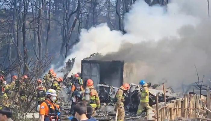 韓國消防部門在墜機(jī)現(xiàn)場滅火。圖片來源:韓國TBC電視臺視頻截圖
