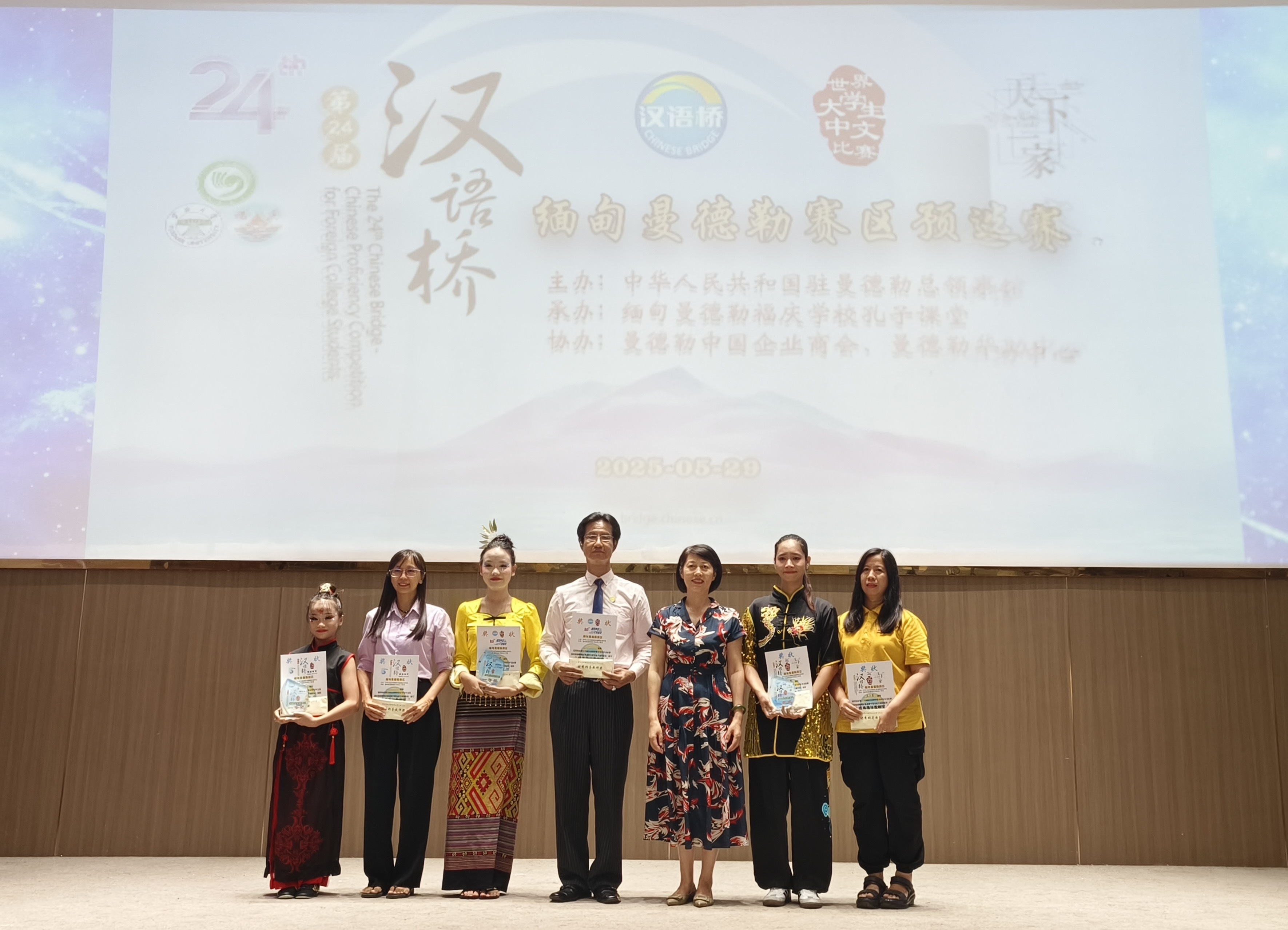中國(guó)駐曼德勒總領(lǐng)事高萍為2025年“漢語橋”中文比賽緬甸曼德勒賽區(qū)優(yōu)勝選手頒獎(jiǎng)。中國(guó)駐曼德勒總領(lǐng)事館供圖
