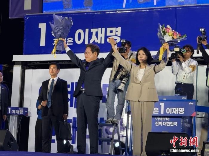圖為6月4日凌晨,李在明攜夫人金惠景在汝矣島國會附近向國民致謝。中新社記者 劉旭 攝