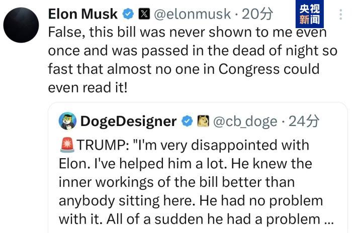 在特朗普發(fā)表對(duì)馬斯克的評(píng)價(jià)后,馬斯克迅速在社交媒體上回應(yīng)并反駁稱,“大錯(cuò)特錯(cuò),這項(xiàng)法案一次也沒(méi)有給我看過(guò),而且是在深夜迅速通過(guò)的!”