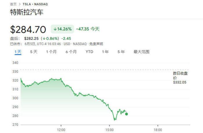 6月5日,馬斯克與特朗普反目互懟后不久,由馬斯克任首席執(zhí)行官的電動(dòng)汽車企業(yè)特斯拉的市值迅速蒸發(fā)了約千億美元,特斯拉股價(jià)當(dāng)日一度暴跌16%。截至當(dāng)天收盤,特斯拉股價(jià)較開盤時(shí)跌去14.26%,市值蒸發(fā)超1500億美元。