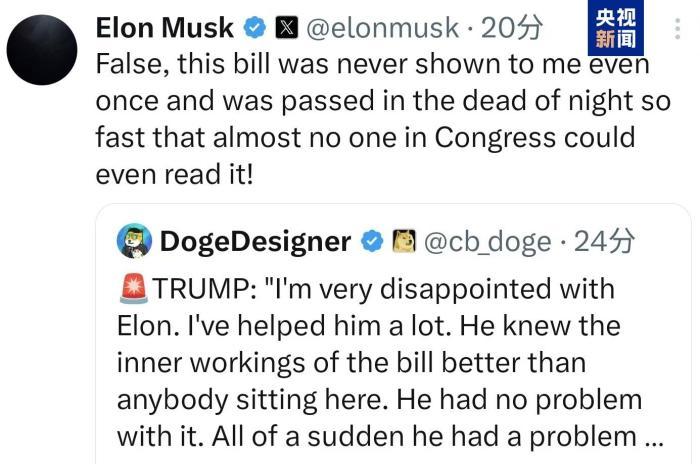 △6月5日,埃隆·馬斯克回懟特朗普:“大錯(cuò)特錯(cuò),這項(xiàng)法案一次也沒(méi)有給我看過(guò),而且是在深夜迅速通過(guò)的!”