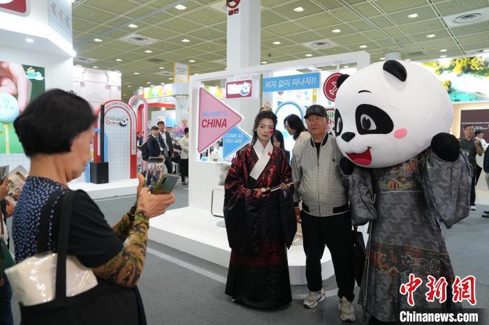 當(dāng)?shù)貢r(shí)間6月5日,觀眾在首爾國際旅游展中國主題展區(qū)與“熊貓人”合影。中新網(wǎng)記者 劉旭 攝