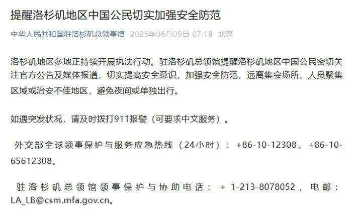 中新網(wǎng)6月9日電 據(jù)中國駐洛杉磯總領事館公眾號9日消息,洛杉磯地區(qū)多地正持續(xù)開展執(zhí)法行動。駐洛杉磯總領館提醒洛杉磯地區(qū)中國公民密切關注官方公告及媒體報道,切實提高安全意識,加強安全防范,遠離集會場所、人員聚集區(qū)域或治安不佳地區(qū),避免夜間或單獨出行。