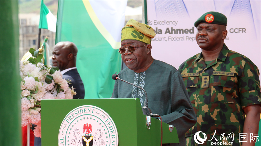 尼日利亞總統(tǒng)提努布(右二)致辭。人民網(wǎng)記者 姜宣攝
