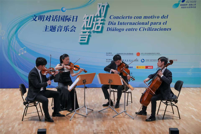 音樂會由中國交響樂團紫禁城弦樂四重奏傾情演繹。為體現(xiàn)文明交流互鑒的初衷,精心設計的曲目涵蓋中國傳統(tǒng)樂曲和西方經(jīng)典作品,從旋律昂揚的《金蛇狂舞》、清新優(yōu)雅的《茉莉花》、氣勢磅礴的《賽馬》到婉轉悠揚的貝多芬c小調(diào)第四號弦樂四重奏,在時而激蕩、時而細膩的旋律聲中,觀眾們仿佛穿梭于中華風韻與西方古典之間,沉浸于多元文明交匯融合的藝術境界。音樂廳內(nèi)氣氛熱烈、掌聲雷動,許多西班牙觀眾表示,音樂的感染力沒有國界,中國傳統(tǒng)音樂所展現(xiàn)出的文化底蘊和情感共鳴令人震撼與感動。
