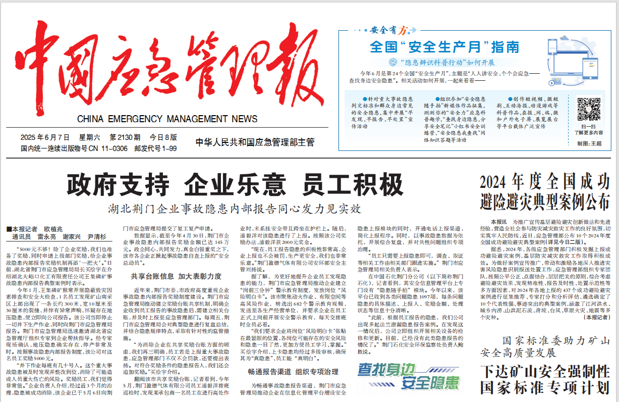 省應(yīng)急管理廳組織中國(guó)應(yīng)急管理報(bào)、人民網(wǎng)、湖北日?qǐng)?bào)、湖北電視臺(tái)、極目新聞等省內(nèi)主流媒體開(kāi)展“安全生產(chǎn)楚天行”活動(dòng),結(jié)合“安全生產(chǎn)月”重點(diǎn)活動(dòng)主題,就“安全吹哨人”(含公眾隱患舉報(bào)獎(jiǎng)勵(lì)、企業(yè)內(nèi)部隱患報(bào)告)制度落實(shí)典型單位開(kāi)展宣傳報(bào)道。中國(guó)應(yīng)急管理報(bào)頭版頭條、湖北日?qǐng)?bào)大幅版面對(duì)湖北案例予以報(bào)道。安全月期間,省應(yīng)急管理廳還將組織媒體采訪團(tuán)集中采訪報(bào)道省安委會(huì)掛牌督辦重大隱患排查整治工作推進(jìn)情況。