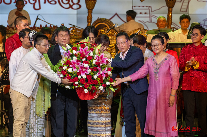 中國(guó)駐緬甸大使馬珈和緬甸宣傳部長(zhǎng)貌貌翁共同向緬甸藝術(shù)家致謝。人民網(wǎng)記者 謝佳君攝