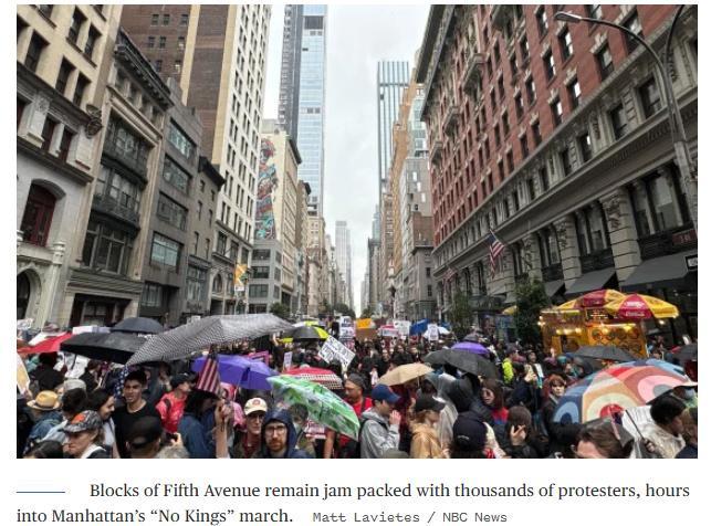 從紐約到洛杉磯,數(shù)十萬人走上街頭,高呼“反對國王特朗普”。曼哈頓的雨中,2.5萬名示威者沿第五大道行進;洛杉磯聯(lián)邦大樓前,催淚瓦斯彌漫,一名年輕女子被按倒在地,胡椒噴霧噴向她的臉。