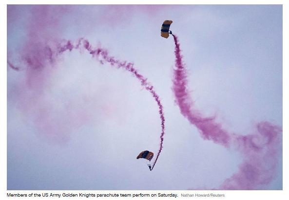 美國陸軍“黃金騎士”跳傘表演隊從空中躍下。一名隊員著陸后,向特朗普獻上美國國旗。無人機在頭頂盤旋,機器狗在街道上穿行,觀眾的歡呼聲卻稀稀拉拉。