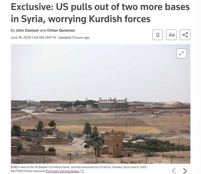 中新網(wǎng)6月18日電 據(jù)路透社當(dāng)?shù)貢r(shí)間17日?qǐng)?bào)道,美軍已從敘利亞東北部的兩個(gè)基地撤出。