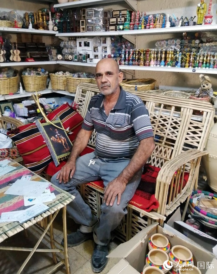 阿布·阿巴斯在經(jīng)營(yíng)的手工藝品店里。人民網(wǎng) 伊納斯·易卜拉欣攝