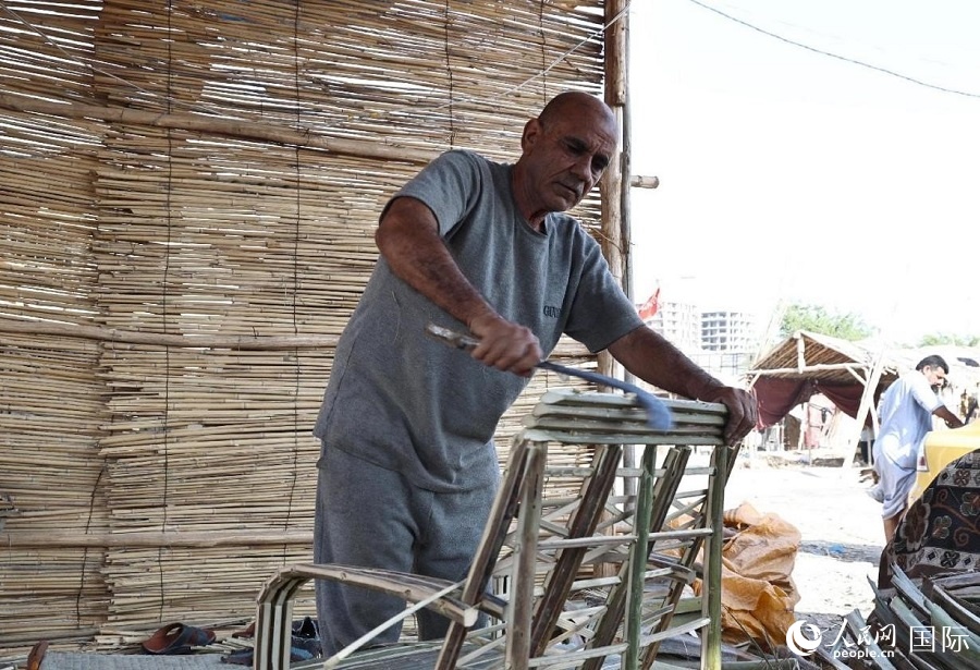阿布·阿巴斯就是這樣一位手藝人。他說(shuō),在巴格達(dá)的老巴扎,曾經(jīng)云集了數(shù)十家棕櫚木家具店,但隨著工業(yè)化發(fā)展,像他這樣還在手工制作棕櫚木桌椅的人掰著手指都數(shù)得過(guò)來(lái)。只見(jiàn)一把柴刀在手,阿布·阿巴斯嫻熟地把一根棕櫚桿削成木條,釘在框架上做成了椅子靠背。終而復(fù)始,很快一把椅子就做成了。
