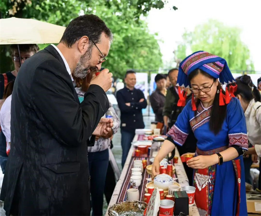 文化活動區(qū)同樣熱鬧非凡。中國音樂學(xué)院民樂團帶來琵琶、古箏、笛子等傳統(tǒng)樂器演奏,悠揚旋律與鼓點交融,展現(xiàn)中華傳統(tǒng)音樂之美。由盧森堡中國文化中心與云南省文化和旅游廳聯(lián)合主辦的“茶和天下”非遺主題展則以云南少數(shù)民族文化為核心,呈現(xiàn)茶藝、服飾、文創(chuàng)等內(nèi)容,吸引大批觀眾駐足體驗。現(xiàn)場設(shè)有滇紅、普洱等名茶品鑒與特色茶點試吃區(qū),濃郁中國風(fēng)令人流連忘返。