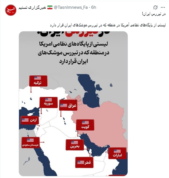 有外媒報(bào)道稱(chēng),伊朗塔斯尼姆通訊社發(fā)布的這張圖片,證實(shí)了至少有10處美國(guó)在中東的軍事設(shè)施處于伊朗導(dǎo)彈系統(tǒng)的射程之內(nèi)。
