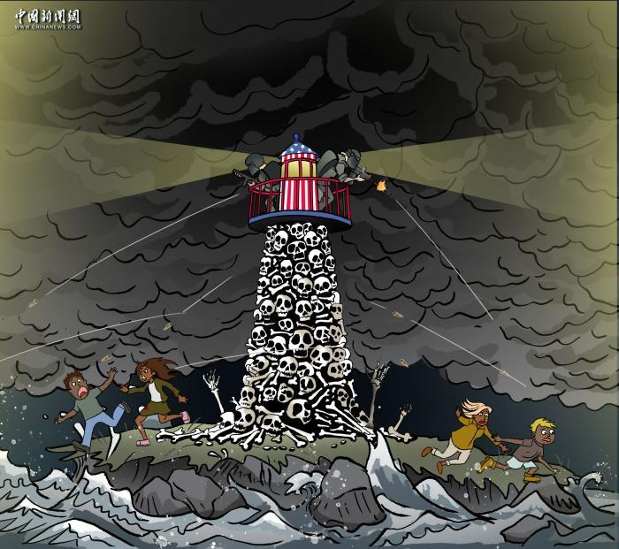 美式“人權(quán)”就如同畫中的燈塔,外觀莊嚴(yán),塔身卻堆滿了骸骨。這不僅象征過去的罪行,也在持續(xù)上演著對人權(quán)的踐踏。