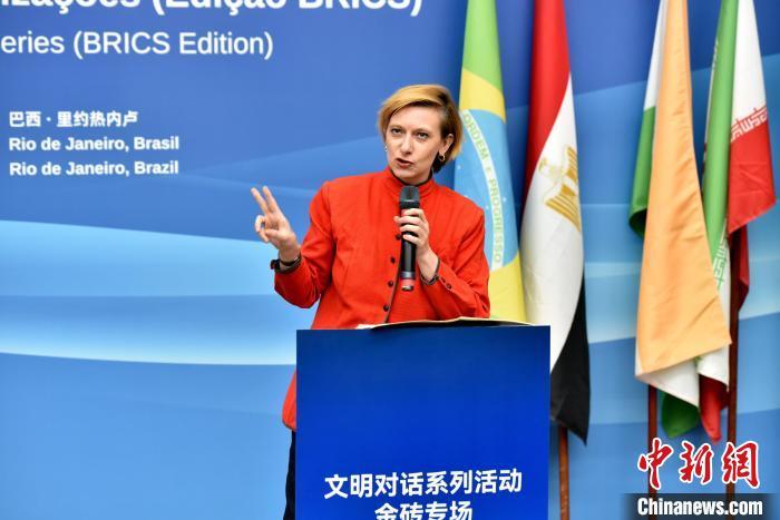 當?shù)貢r間6月27日,文明對話系列活動(金磚專場)在巴西里約熱內(nèi)盧舉行。俄羅斯金磚國家研究青年學(xué)者、中醫(yī)藥愛好者埃琳娜·基里納在講述她的金磚故事。記者 林春茵 攝