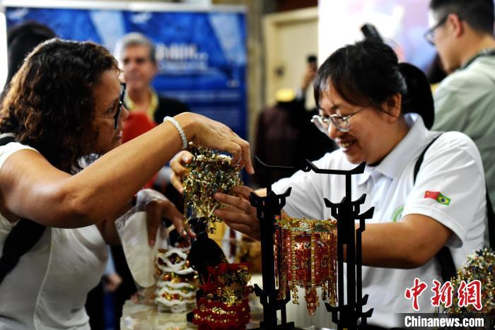 當(dāng)?shù)貢r(shí)間6月27日,文明對(duì)話系列活動(dòng)(金磚專場(chǎng))在巴西里約熱內(nèi)盧舉行。一位巴西觀眾在“歡朋滿粵”嶺南文化創(chuàng)新展上了解國潮鳳冠。中新社記者 林春茵 攝