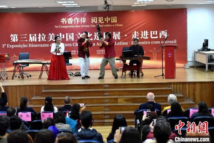 當(dāng)?shù)貢r(shí)間6月28日,巴西圣保羅,中國(guó)傳統(tǒng)音樂樂團(tuán)百花樂團(tuán)在第三屆拉美中國(guó)文化巡回展上演奏國(guó)樂。中新社記者 林春茵 攝