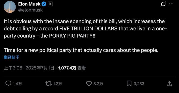 馬斯克還在發(fā)文中批評共和黨。他還稱,是時候建立一個真正關心美國人民的新政黨了。