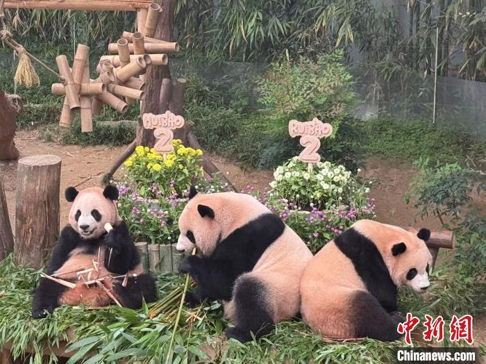7月7日,在韓國(guó)誕生的雌性大熊貓雙胞胎“睿寶”和“輝寶”迎來(lái)兩周歲生日。韓國(guó)愛寶樂園為它們舉辦慶生活動(dòng)。圖為媽媽“愛寶”(中)與雙胞胎大熊貓?jiān)谏諘?huì)上。中新社記者 劉旭 攝